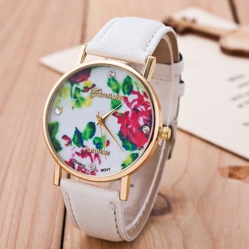 Módní hodinky s bílým páskem, které mají ciferník zdobený květinovým vzorem a čtyřmi třpytivými kamínky.