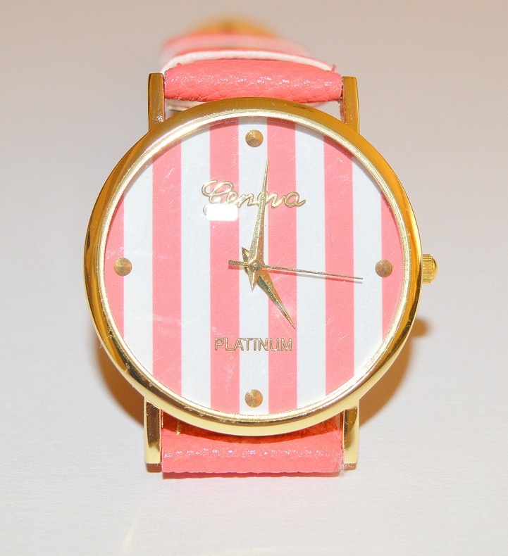 Módní dámské hodinky v růžové barvě. Ciferník je zdobený bílo-růžovými proužky a kamínky zlaté barvy. Obsahují minerální sklo odolné proti poškrábání. Vyměnitelná baterie.
